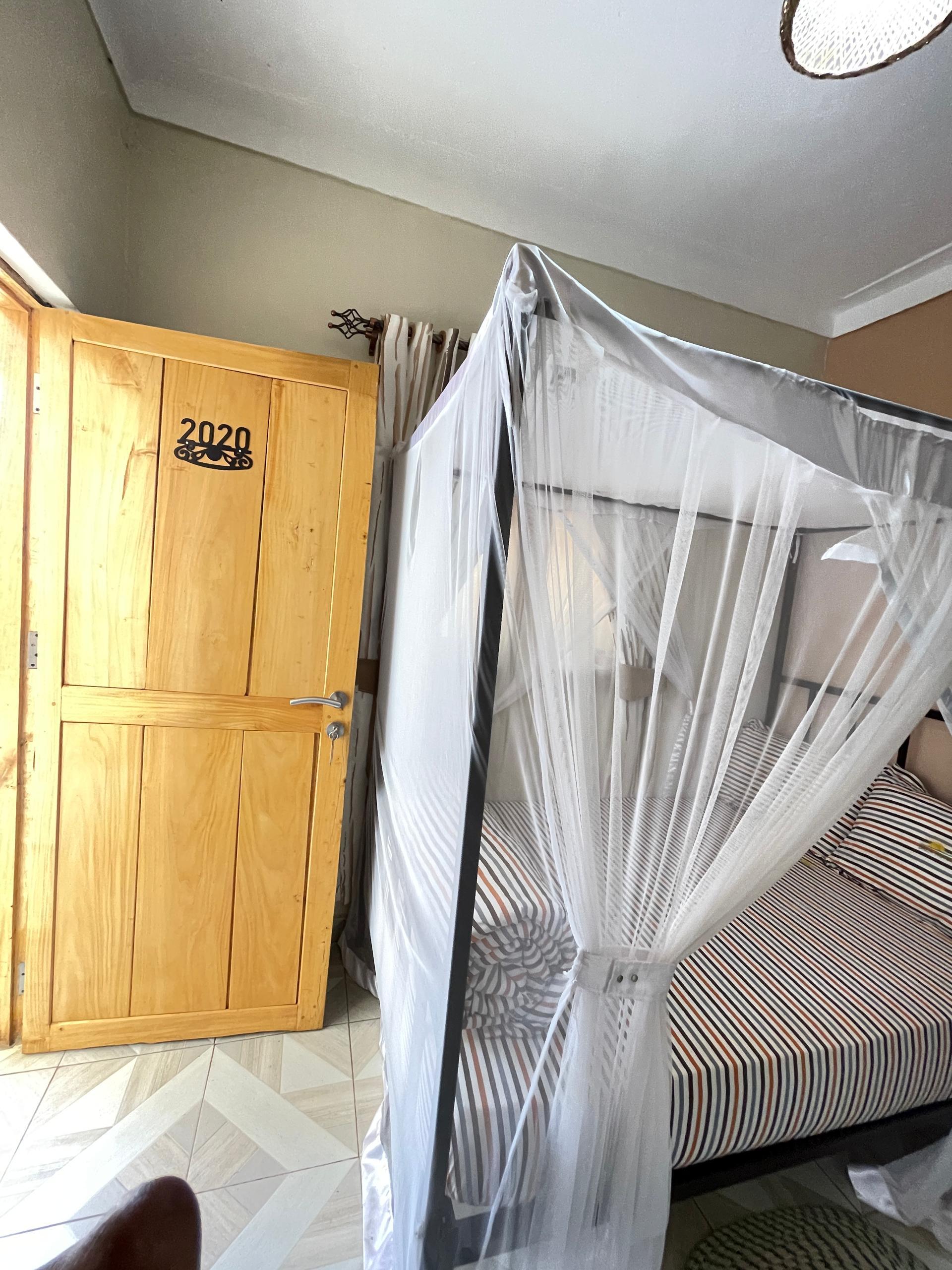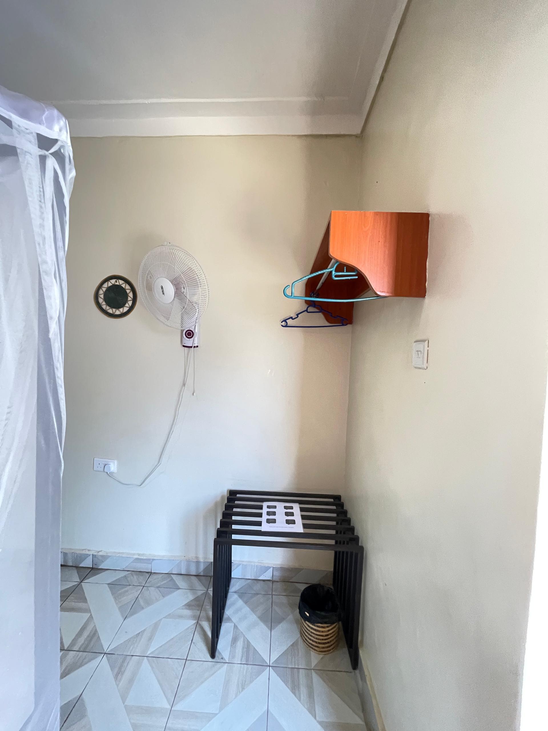 Room is  self contained, has a medium sized bed, Luggage rack, wall fan, clothes hanging facility and is a B n B